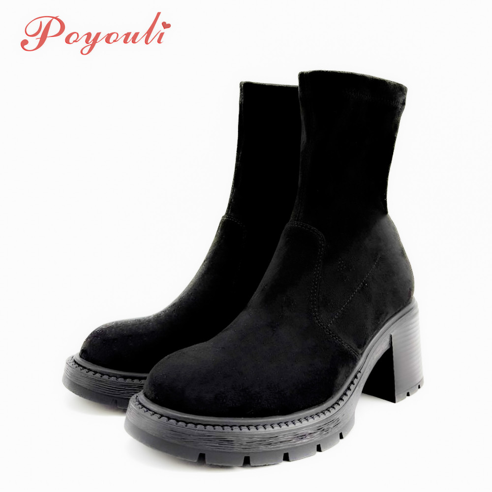 POYOULI帥氣素面方頭顯瘦中跟短靴-駝