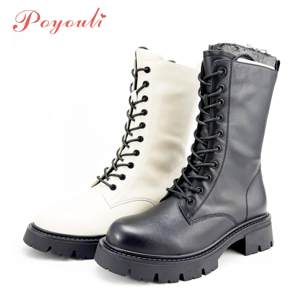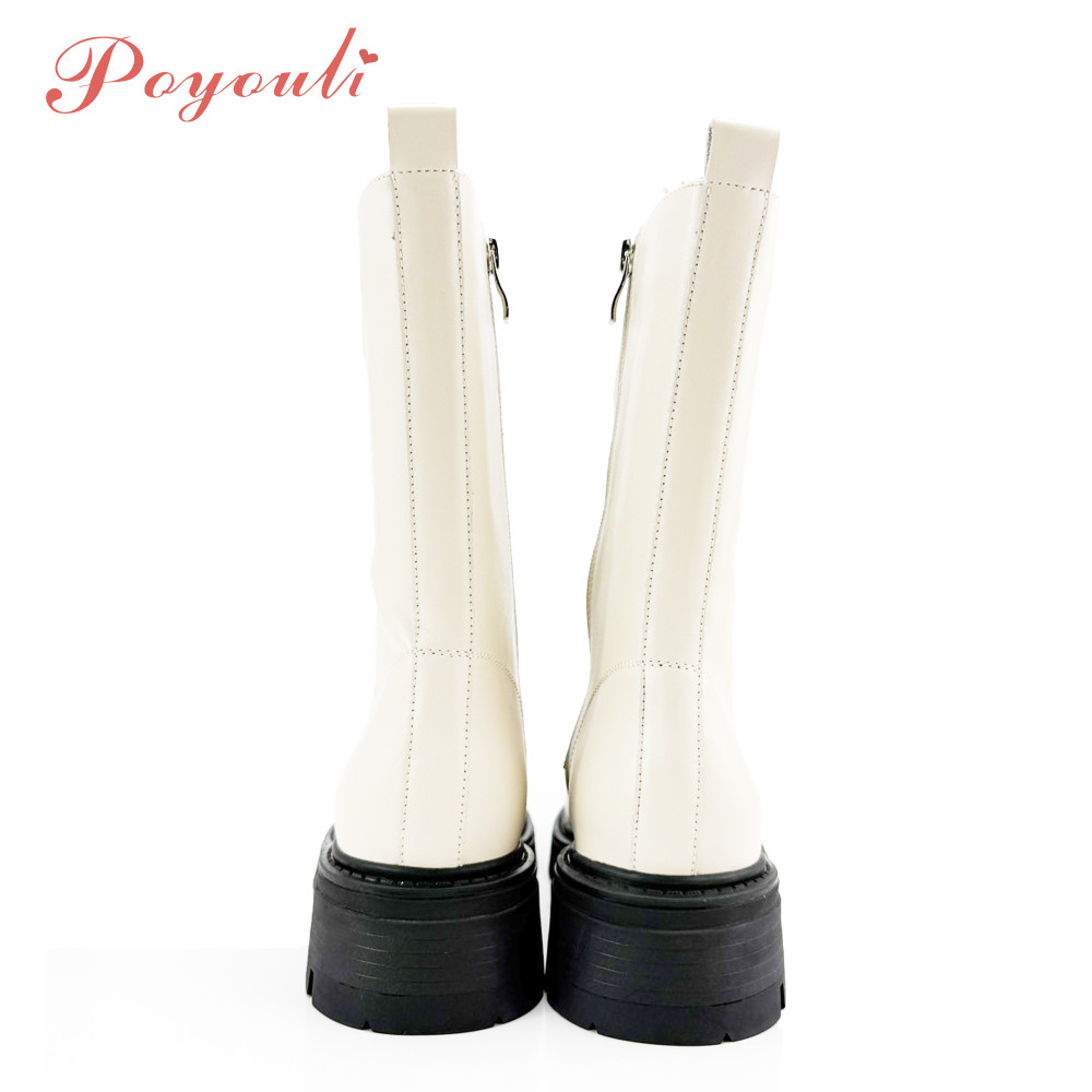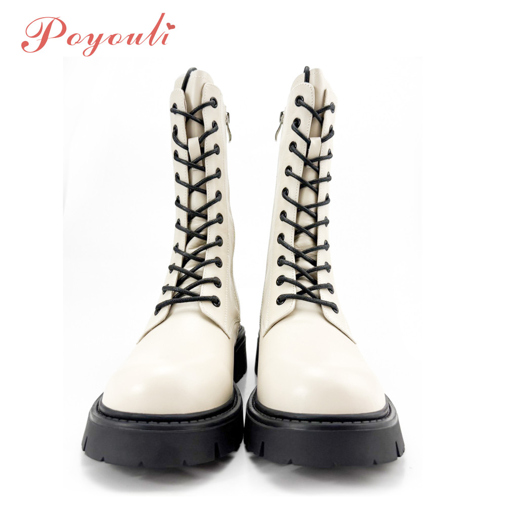POYOULI帥氣女孩綁帶軍行中靴-米